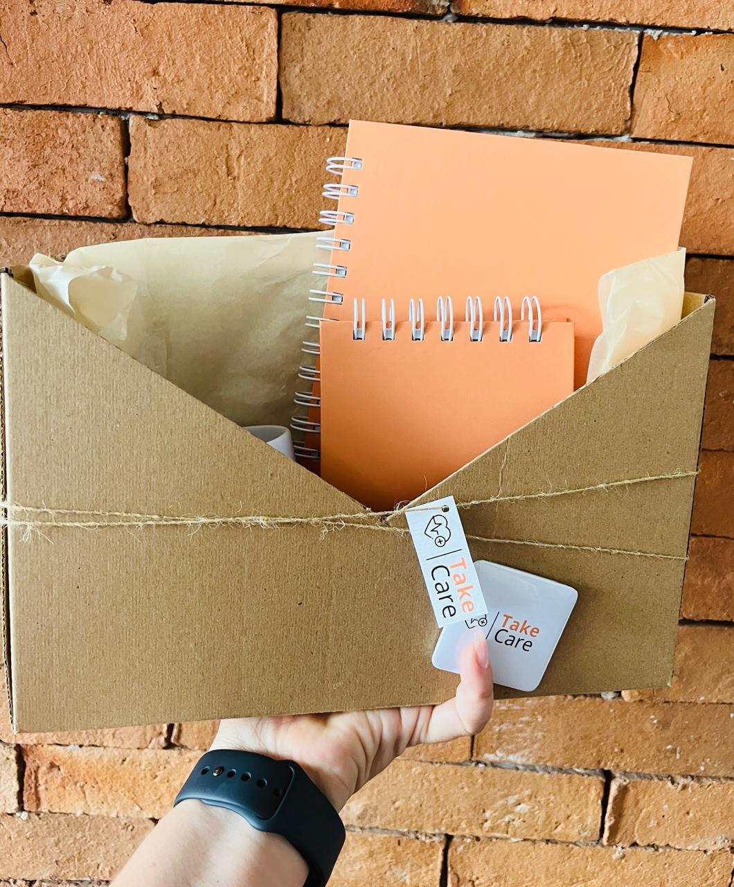 Embalado para presente com caixinha envelope, papel de seda e colmeia, tag, carta de apresnetação da empresa, papel timbrado para anotação de recadinho: